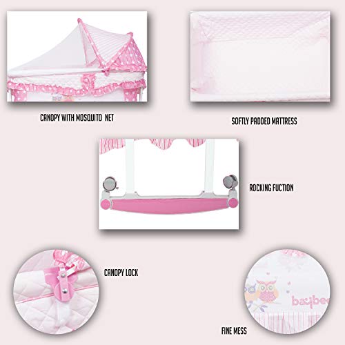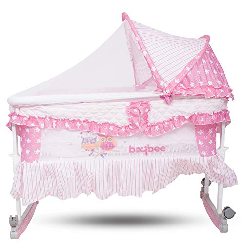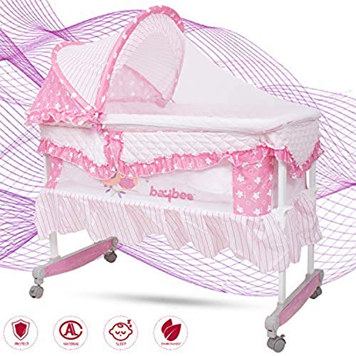 SAFETY: Safety 1st – All Baybee Cradles are EN 716 Certified which is most stringent certification defined by European standards for safety of Baby Cots and Folding Cots for daily use. Every minor point is considered to give safest product to your Baby. Baybee Angel-Hug Bassinet Cradle cum Rocker with Mosquito Net- Canopy and Wheels made from 100% fine eco-friendly, BPA free materials that will always remains safe and hygienic all the time. Strong and sturdy metal alloy frame for durability. PRODUCT: Baybee Angel-Hug Bassinet Cradle cum Rocker with Mosquito Net- Canopy and Wheels with 100% fine eco-friendly materials and Strong and Sturdy metal alloy frame. Four wheels offer convenient mobility for moving the cradle between rooms and transforms into rocking cradle by rotating wheels in upward position. The cradle bed is extra spacious and foam cushioned for baby’s comfort and cosy sleep. All the four wheels have stopper to keep the cot locked and stationary at any time. USAGE: Ideal for indoor use- house, kindergarten, hospitals etc. Comes with easily foldable, removable canopy- mosquito net which can be kept half open in day use or remove it when not in use. Smooth and gentle swing with two position height adjustable. Extra cushioned mattress for baby’s comfort and protect baby’s back and prevent the baby’s spine to deforming. Mosquito net protect the baby from mosquitoes and other insects and effectively prevent the spread of disease.